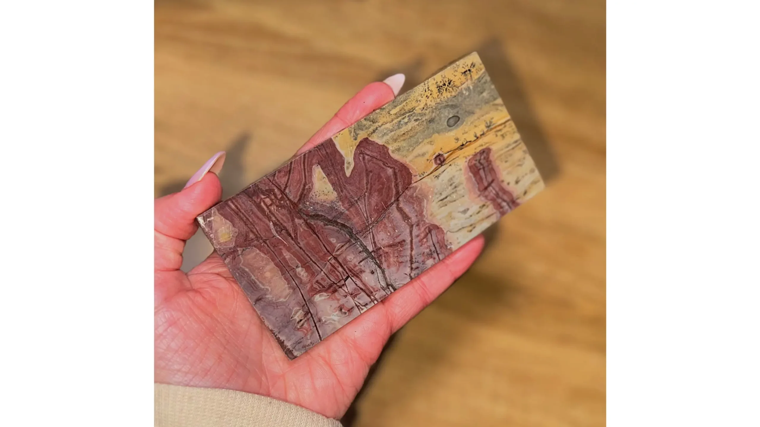This slab carries a grounding that feels maternal rather than heavy. It steadies emotions, slows thought, and invites deep inner listening. Its energy does not push you forward.. it asks you to arrive.