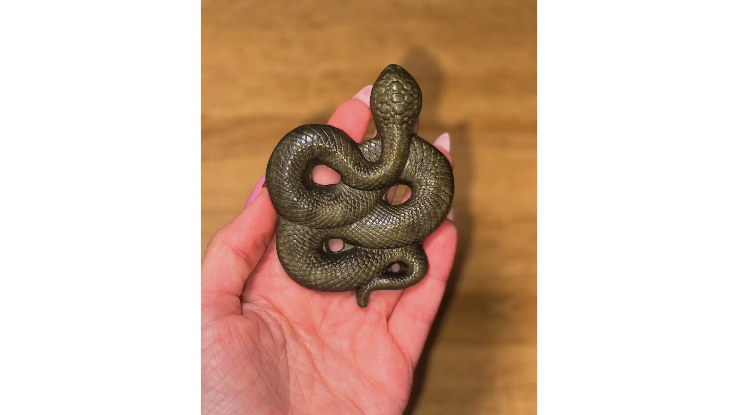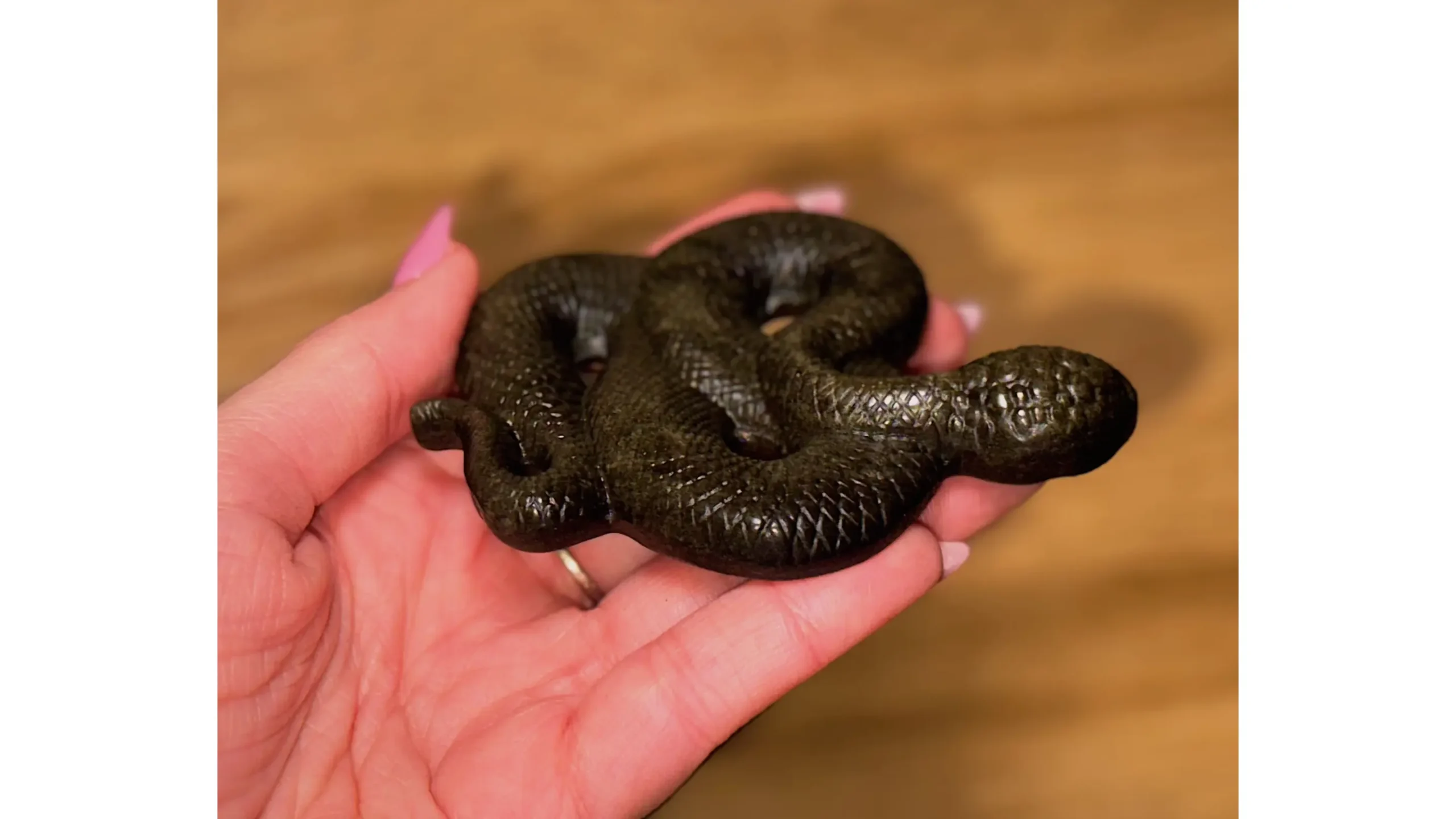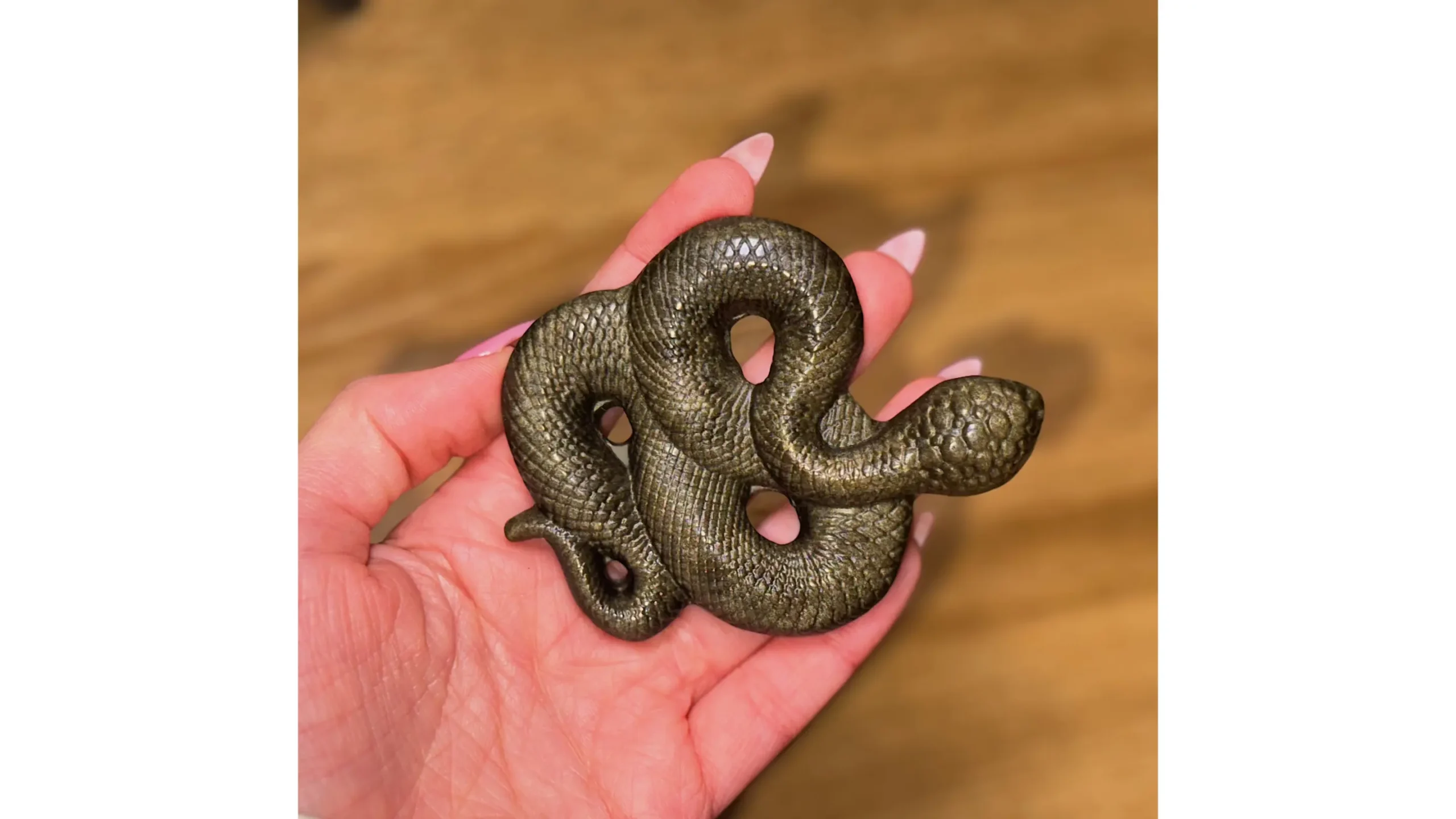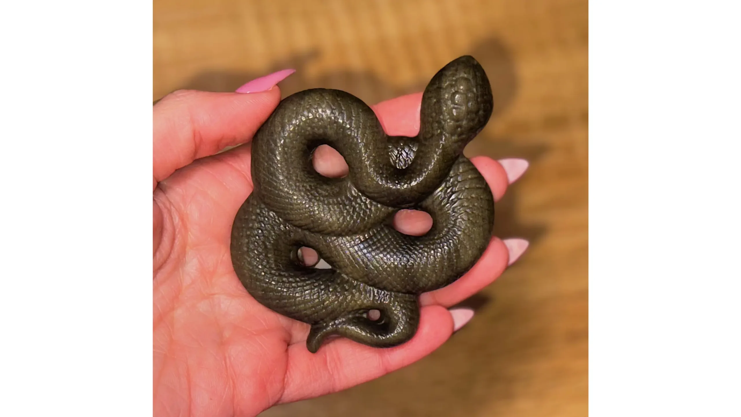 Carved from Golden Sheen Obsidian, this serpent does not merely reflect light..