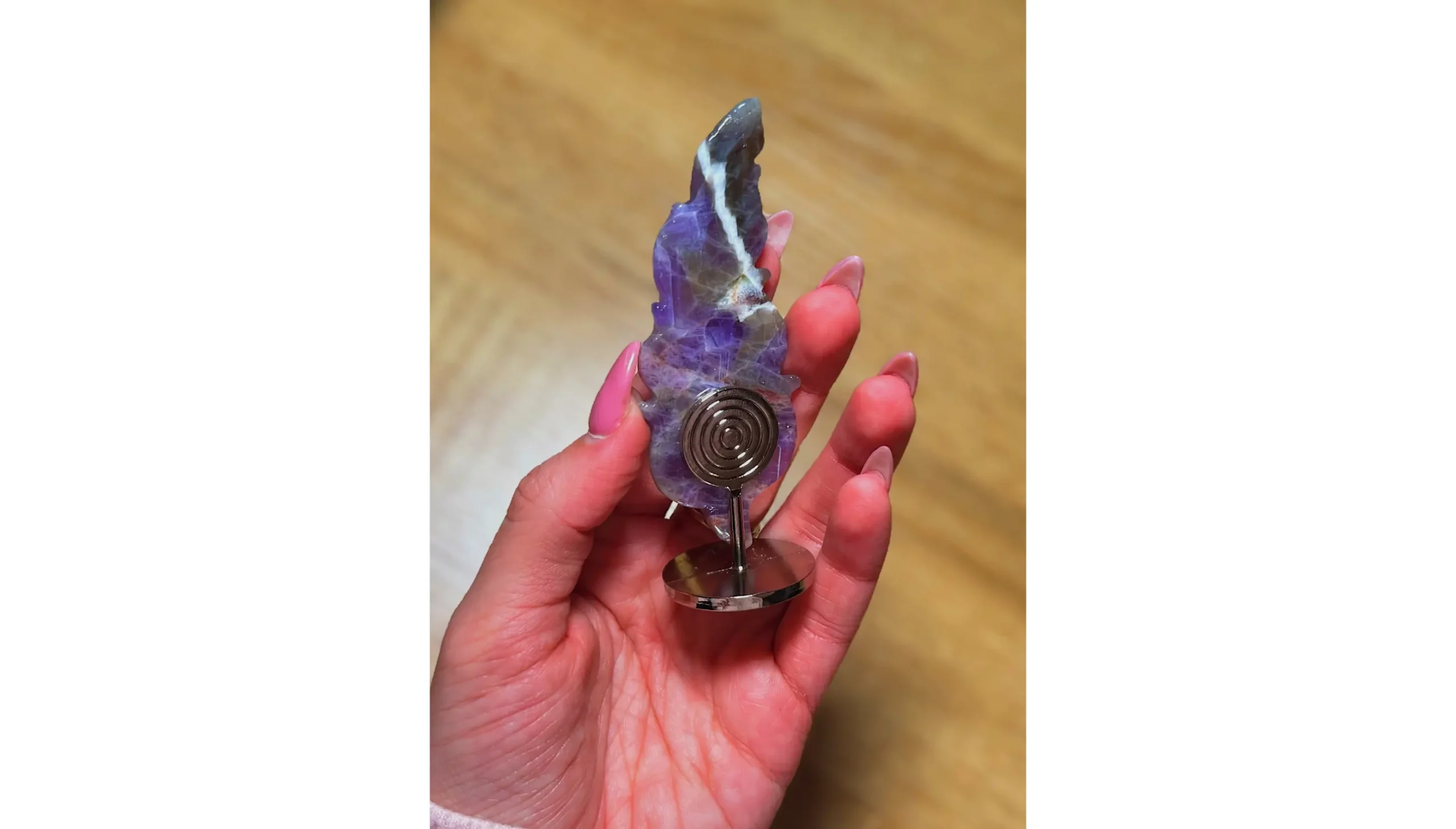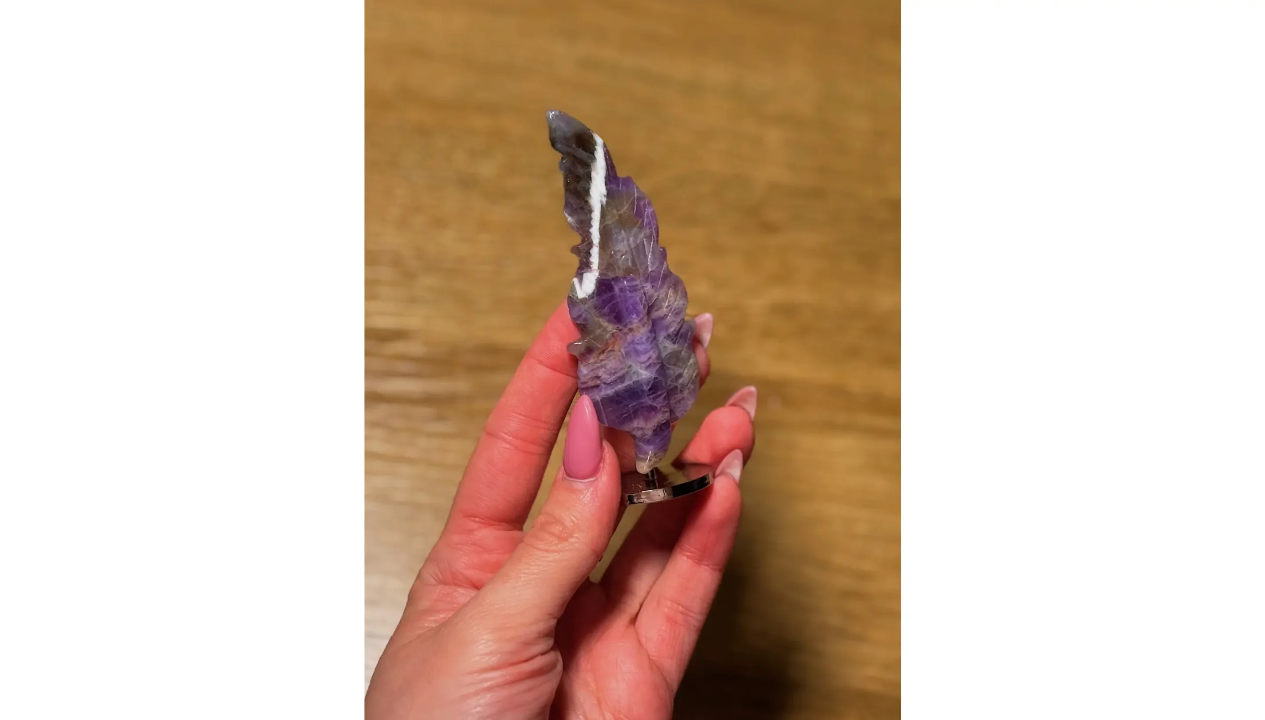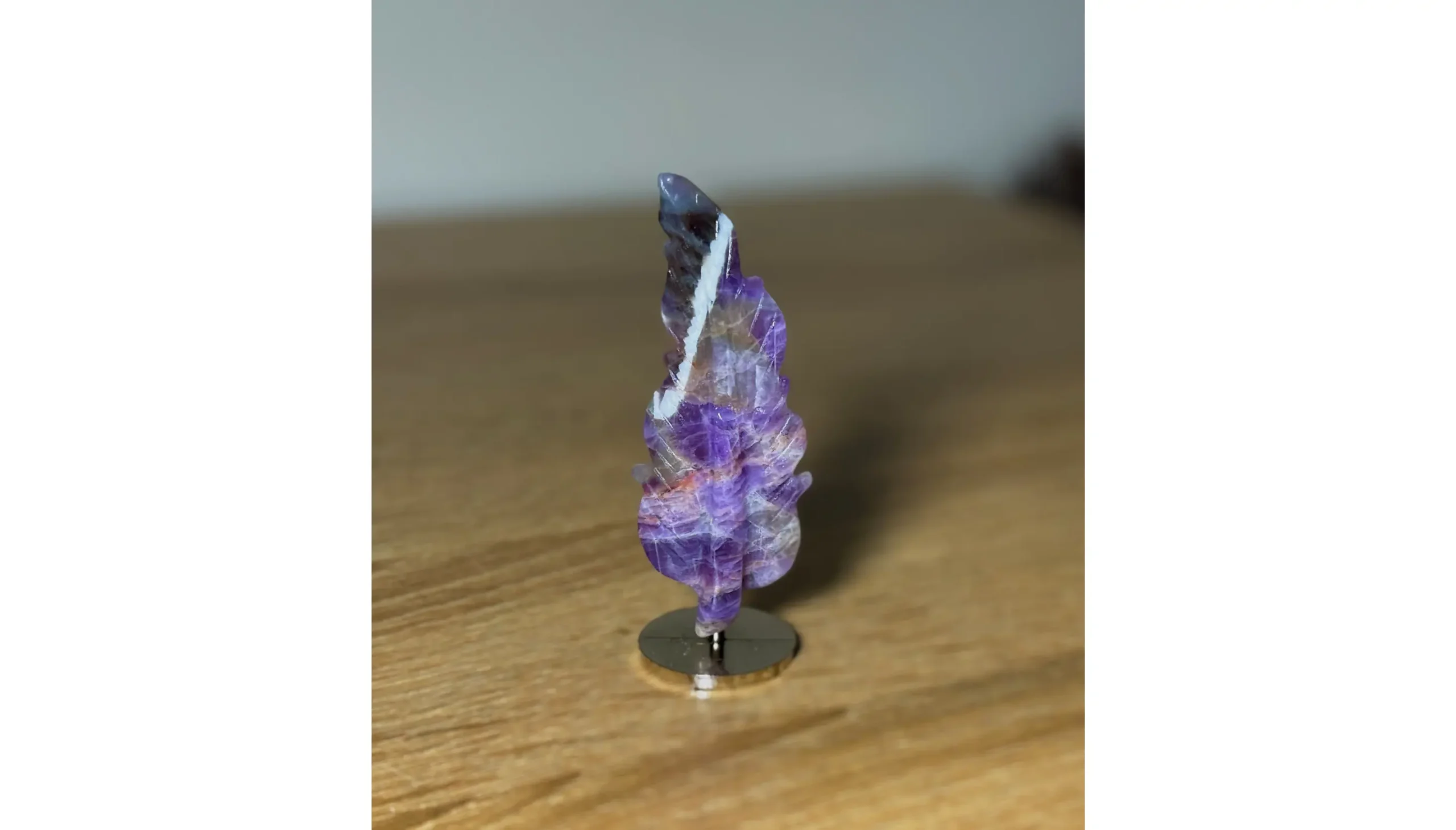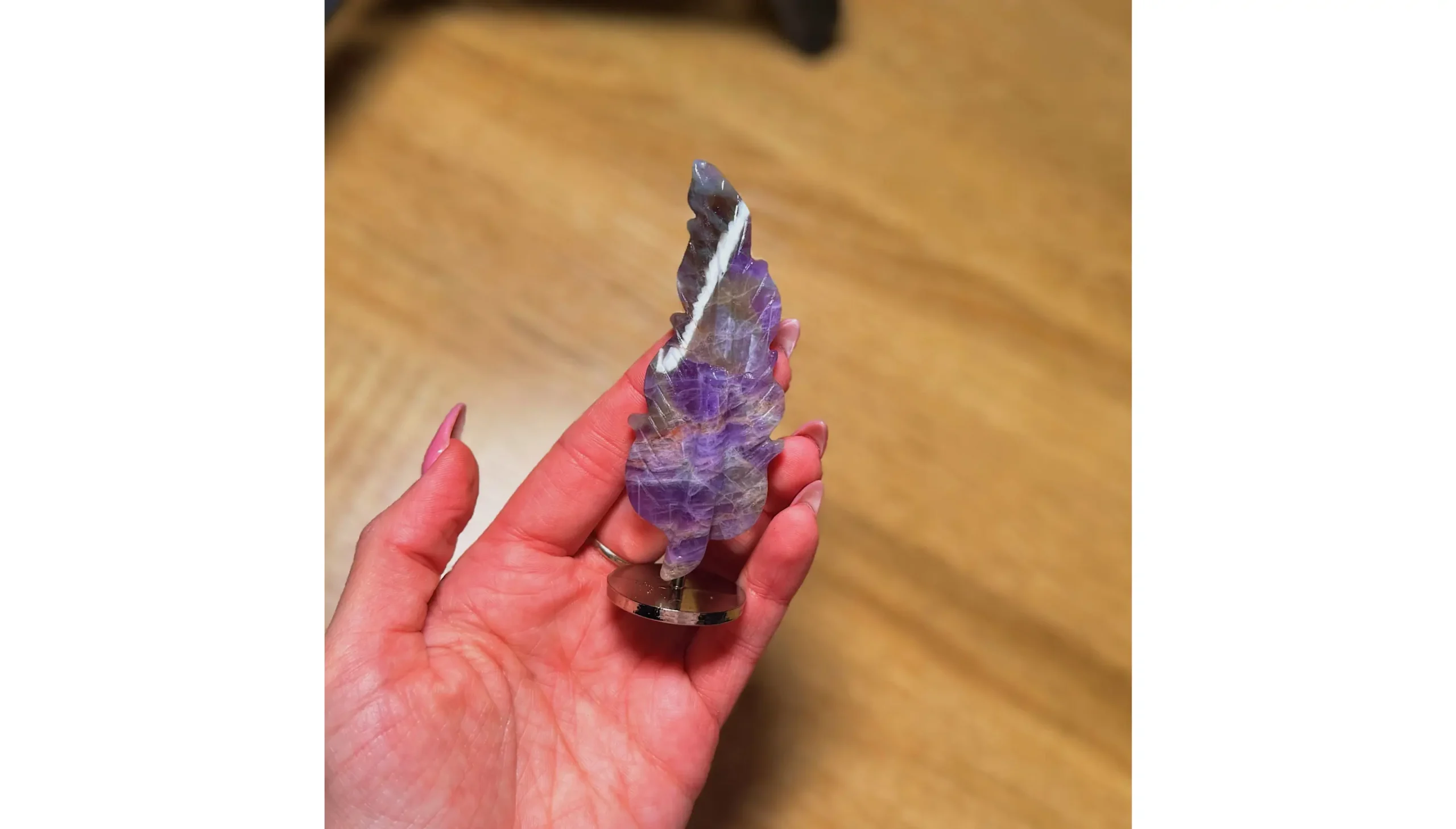 The delicate feather lines flow naturally through the stone, as if the crystal itself once drifted through a magical sky before settling here. Some parts shimmer softly, like tiny stars hidden inside the violet depths. ✨